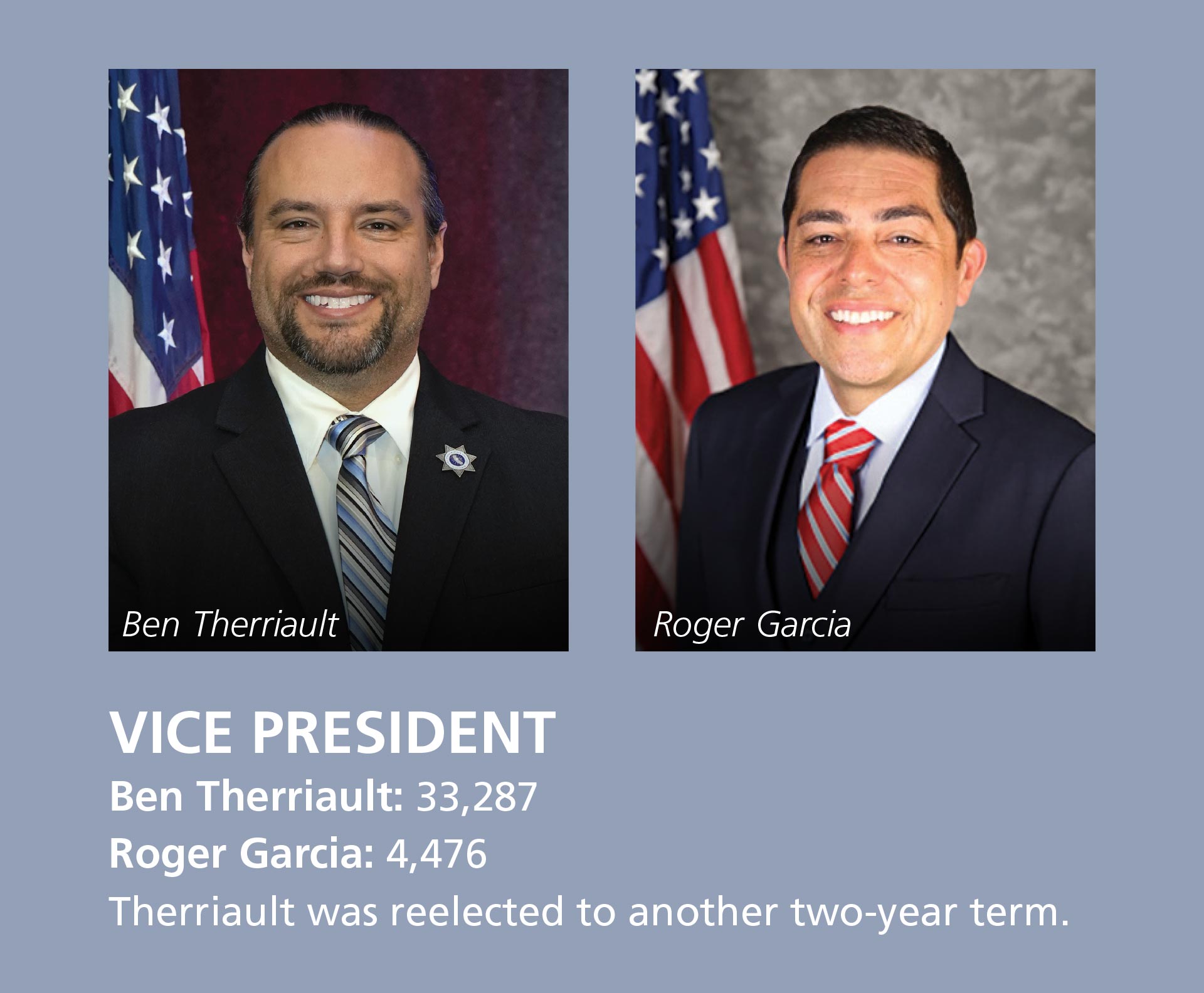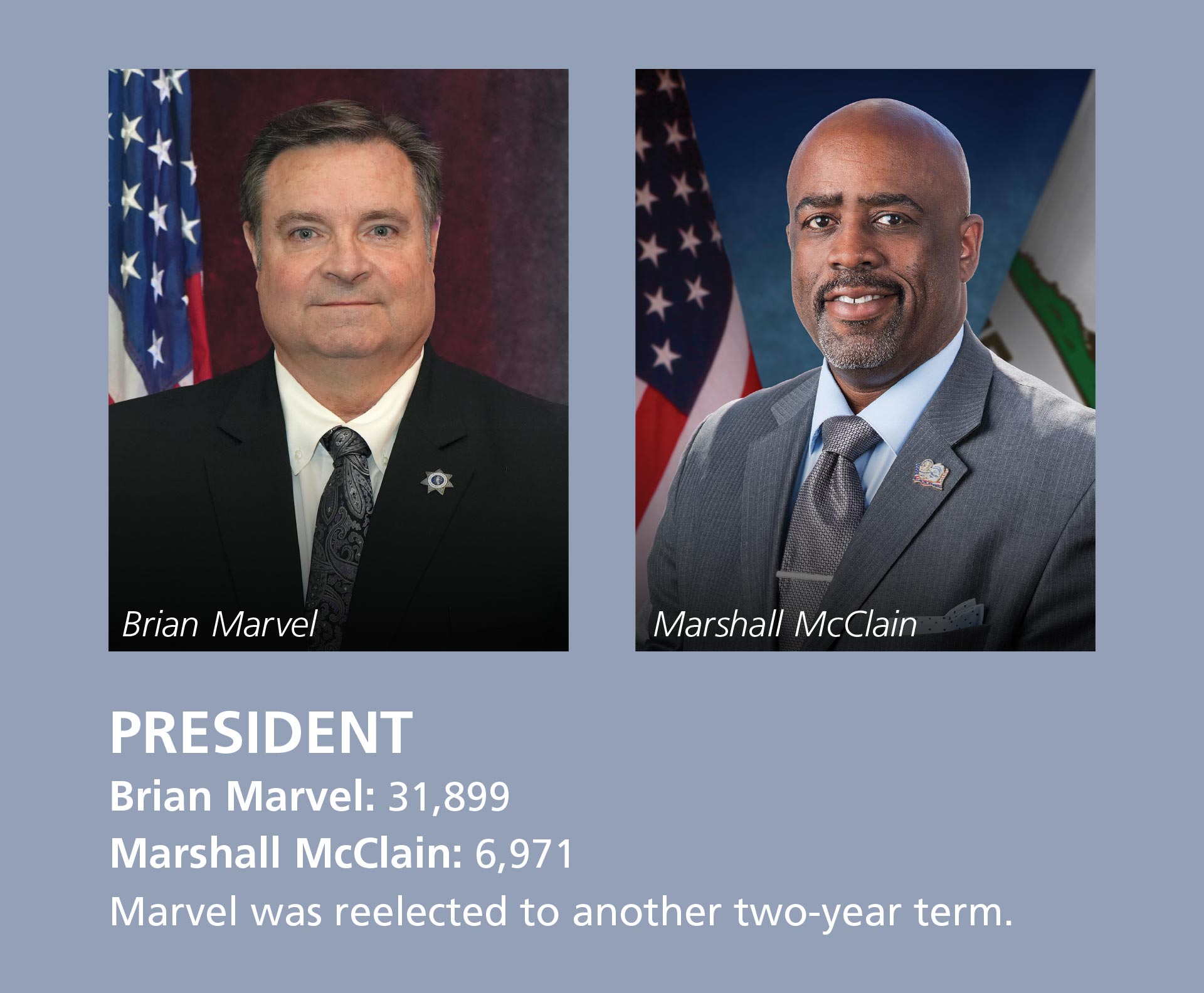 Election of President and Vice President: Marvel was reelected as president, defeating challenger Marshall McClain by a vote of 31,899–6,971. Therriault was also reelected as vice president, receiving 33,287 votes to opponent Roger Garcia’s 4,476. Marvel thanked the membership for their confidence in him, congratulated Therriault and recognized McClain’s and Garcia’s efforts. “When you have these elections, it actually improves the organization, because you get to hear some different voices, a different perspective. … Hopefully, we can take some of the stuff that they brought forward and try to implement it to make the organization even better,” Marvel said.